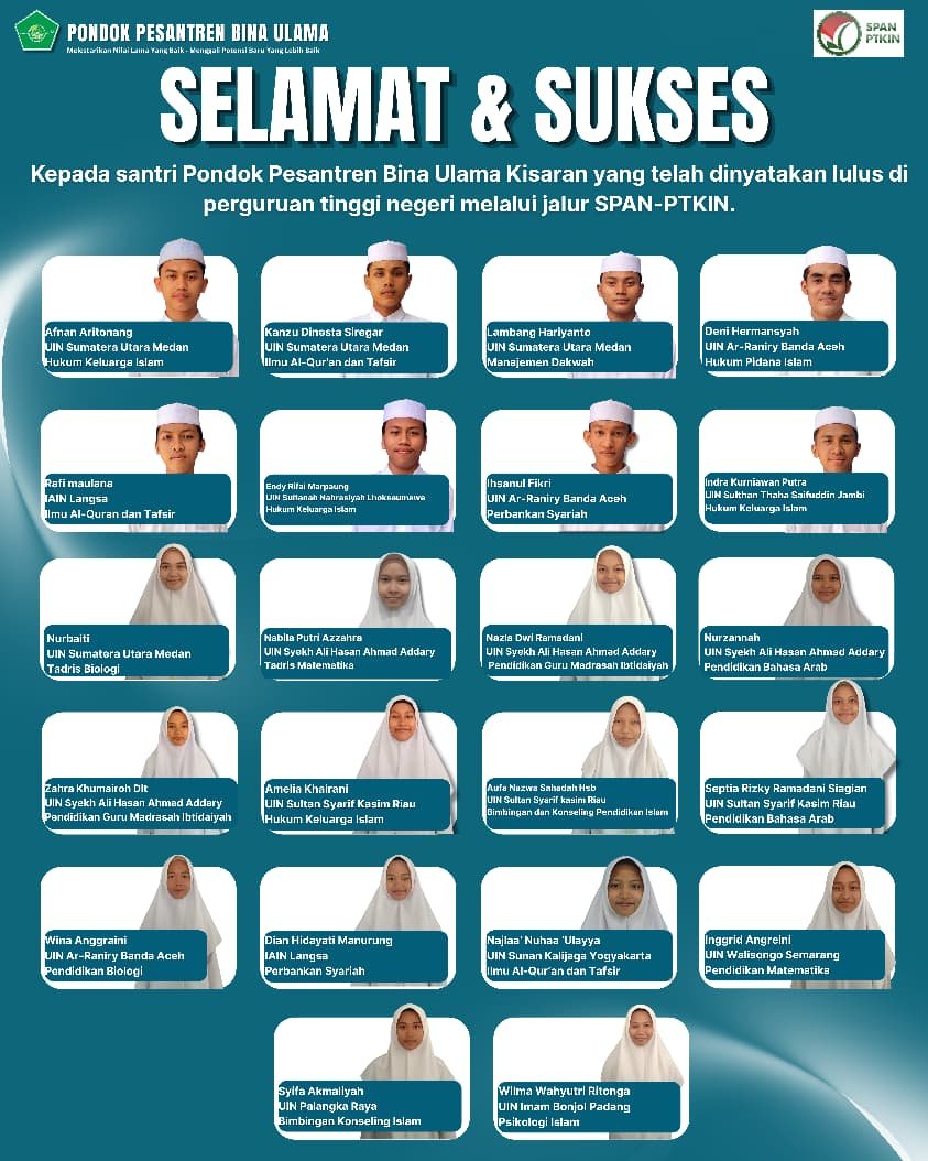 Pondok Pesantren Bina Ulama Kisaran kembali menorehkan prestasi yang membanggakan melalui keberhasilan para santri dalam Seleksi Prestasi Akademik Nasional Perguruan Tinggi Keagamaan Islam Negeri (SPAN-PTKIN). Dengan penuh rasa syukur, keluarga besar pesantren mengucapkan selamat dan sukses kepada para santri yang telah lulus dan diterima di berbagai perguruan tinggi keagamaan Islam negeri di Indonesia.